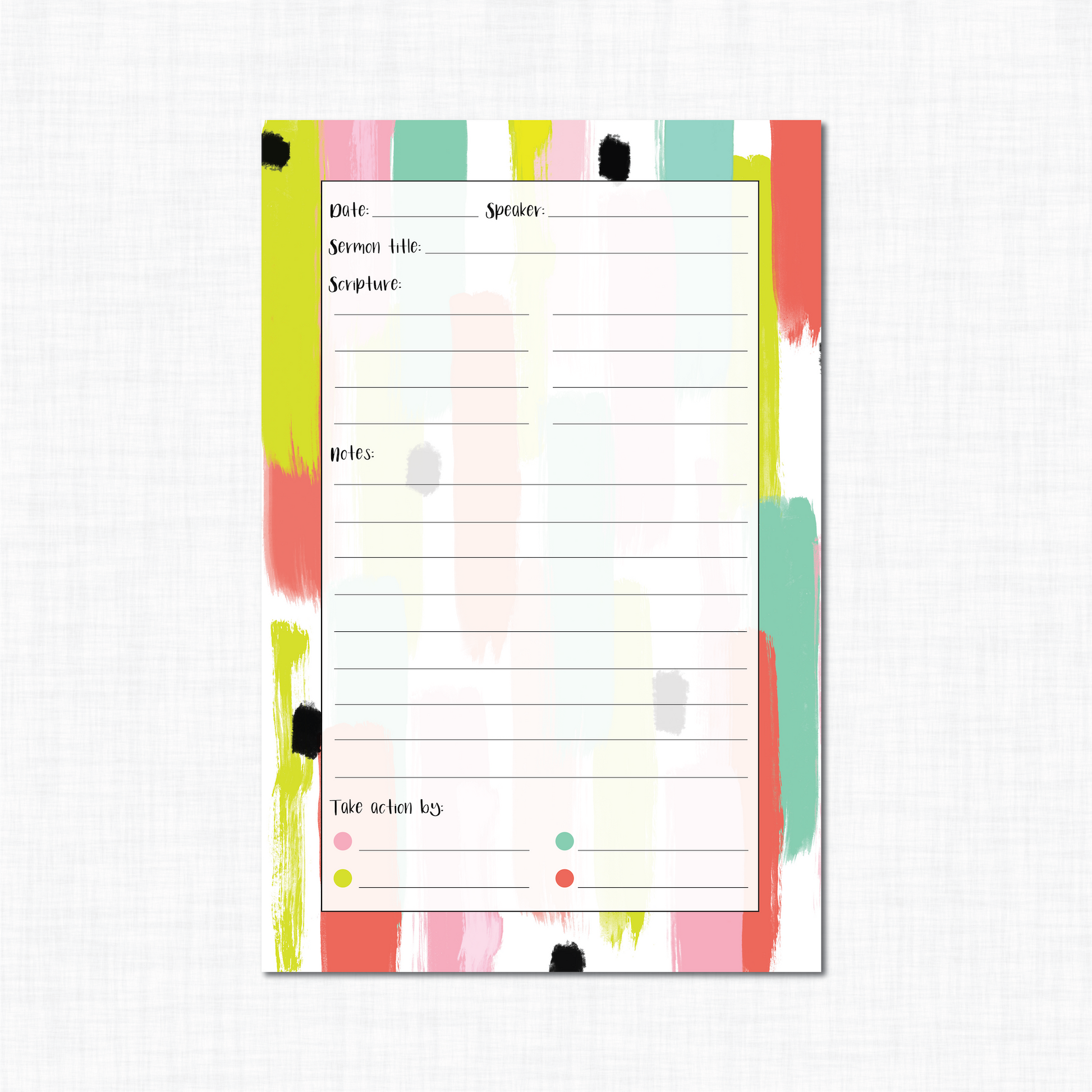 Text reads: Date, speaker, sermon title, scripture, notes, taken action by
